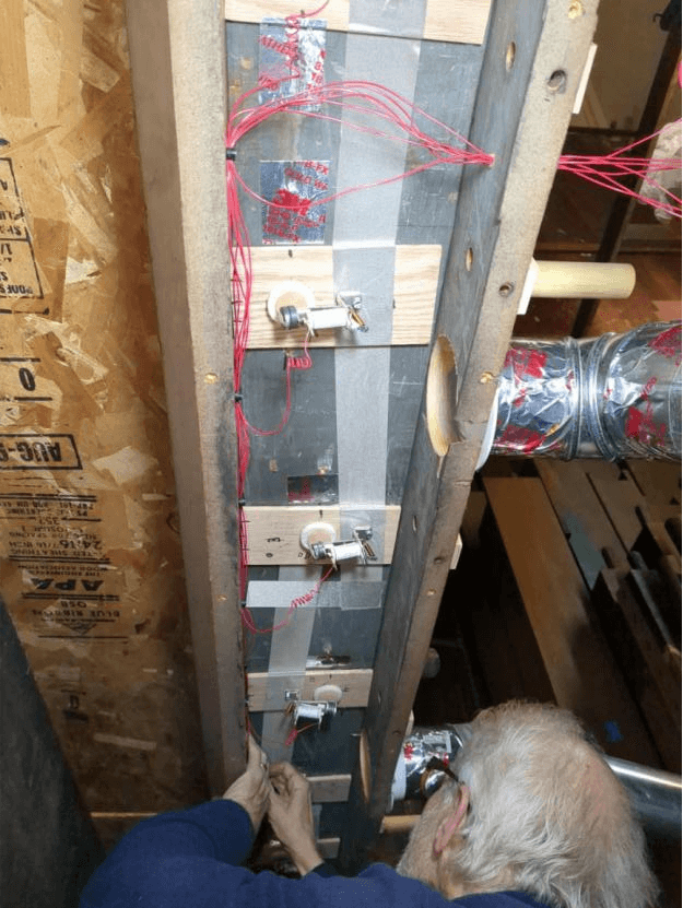 Chris replaced non-functional, Jerry-rigged electro-pneumatic valve system of 14 Grand (aka Double) Open Diapason “tower” pipes of façade with 14 Peterson electromagnetic Super Valves (which ultimately will be doubled to provide adequate air to these huge pipes):