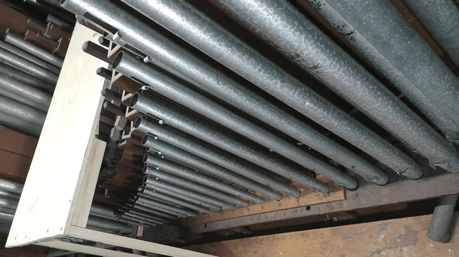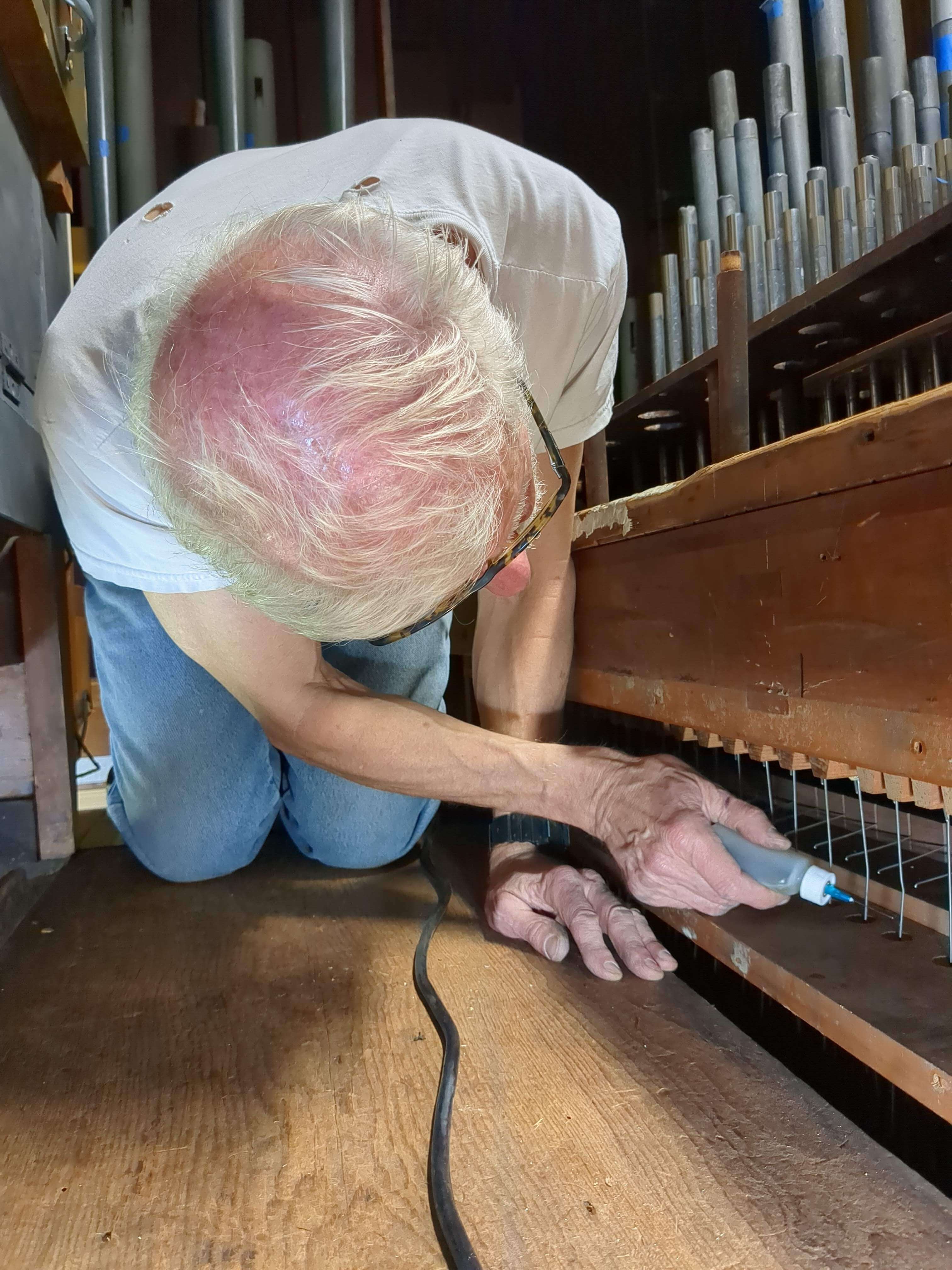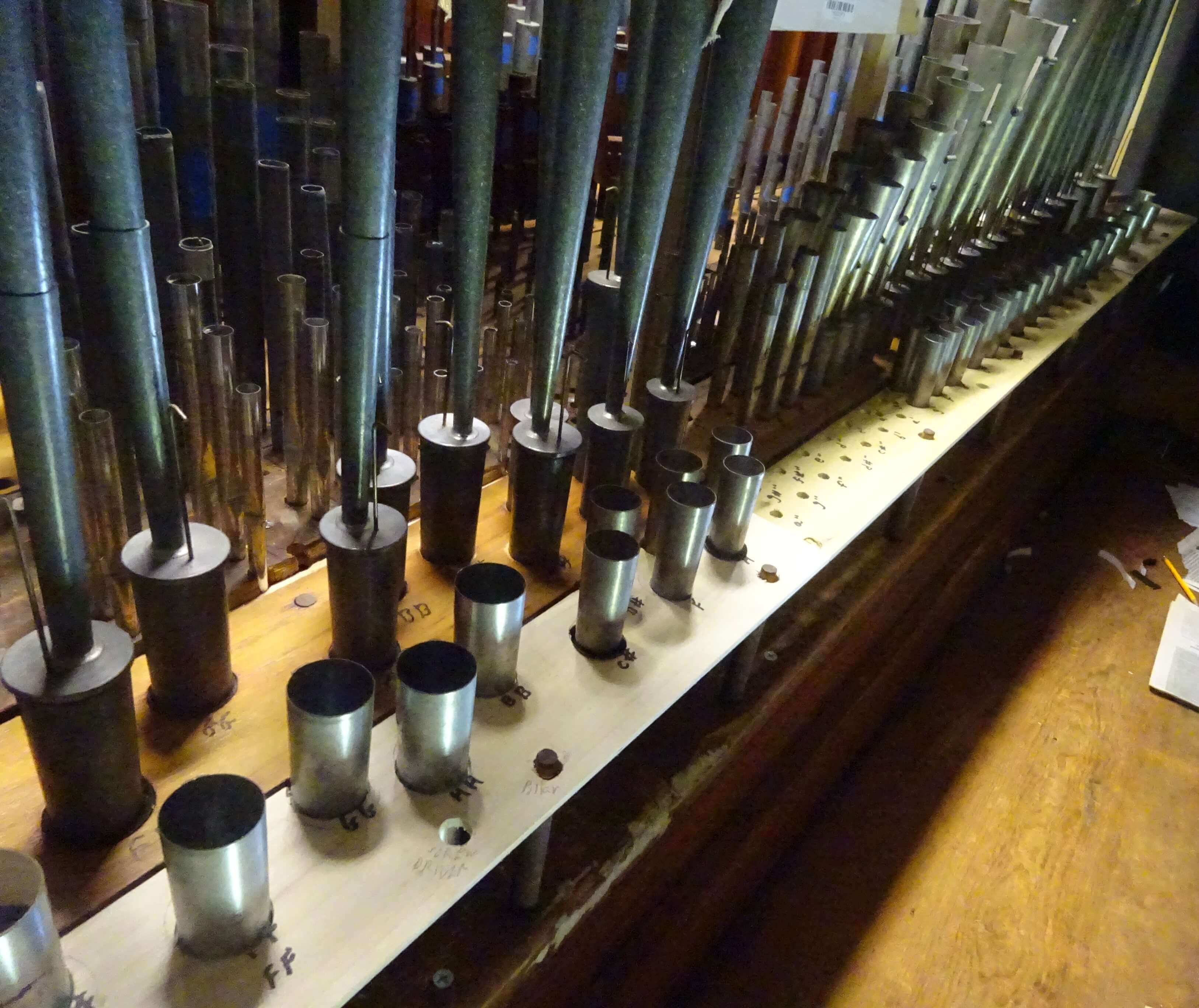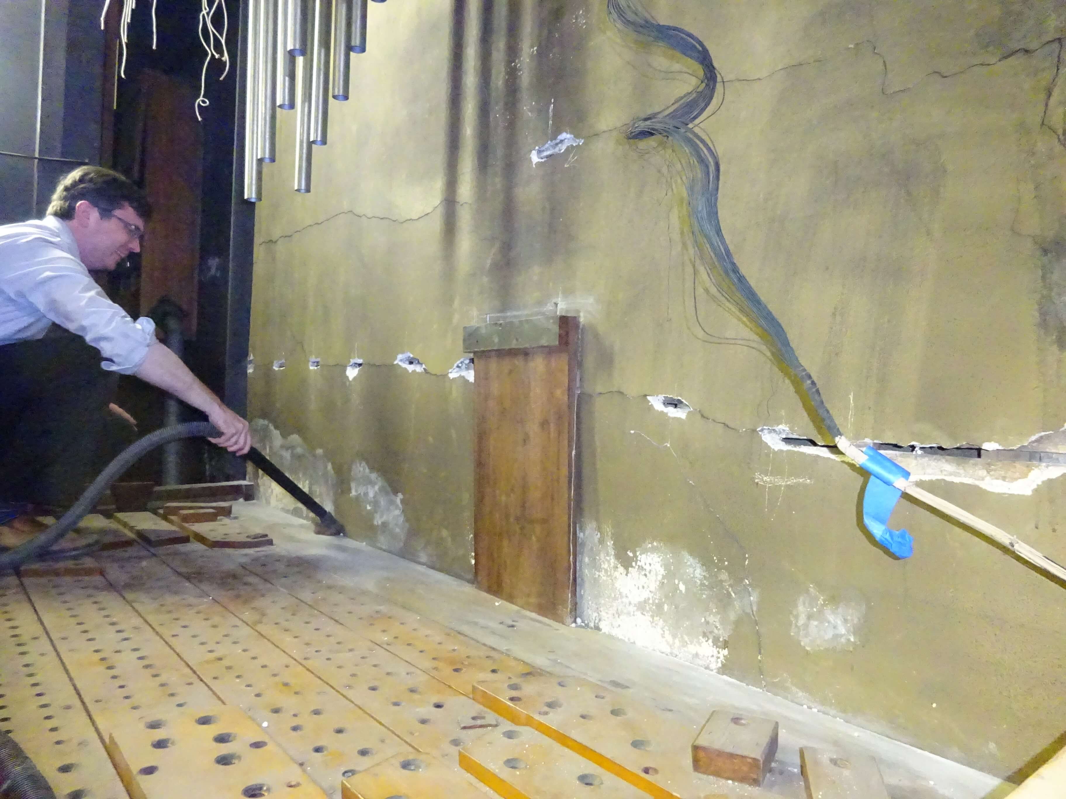 From 2021 to 2023 nearly all pipes were removed, one section of the organ at a time, so that chunks of plaster and plaster dust could be vacuumed from nearly all but the very largest pipes, as well as from the wind chests upon which pipes sit.