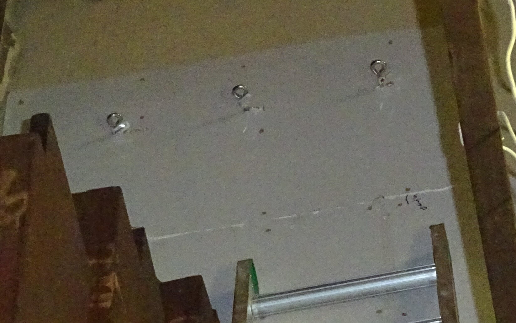 Chris added large steel corner braces to properly secure the sides of organ case to studs in rear wall. He also placed large eye screws into studs across rear wall near top of organ, so next time the ceiling above organ needs repair or painting, protective tarps can be secured to these eye screws and pulled over entire organ. (When the church was repainted some decades ago, paint was splattered over many of the organ pipes!):