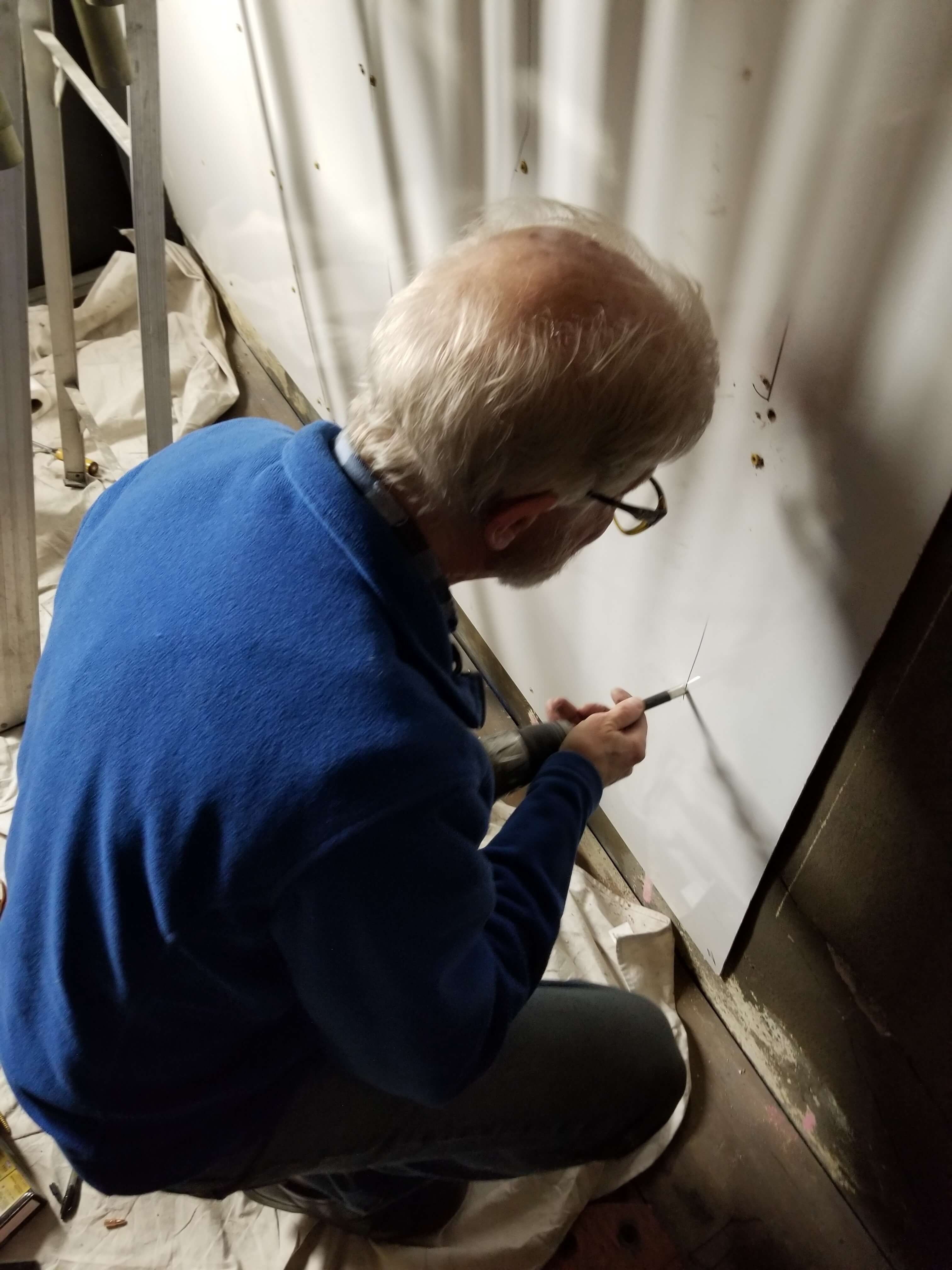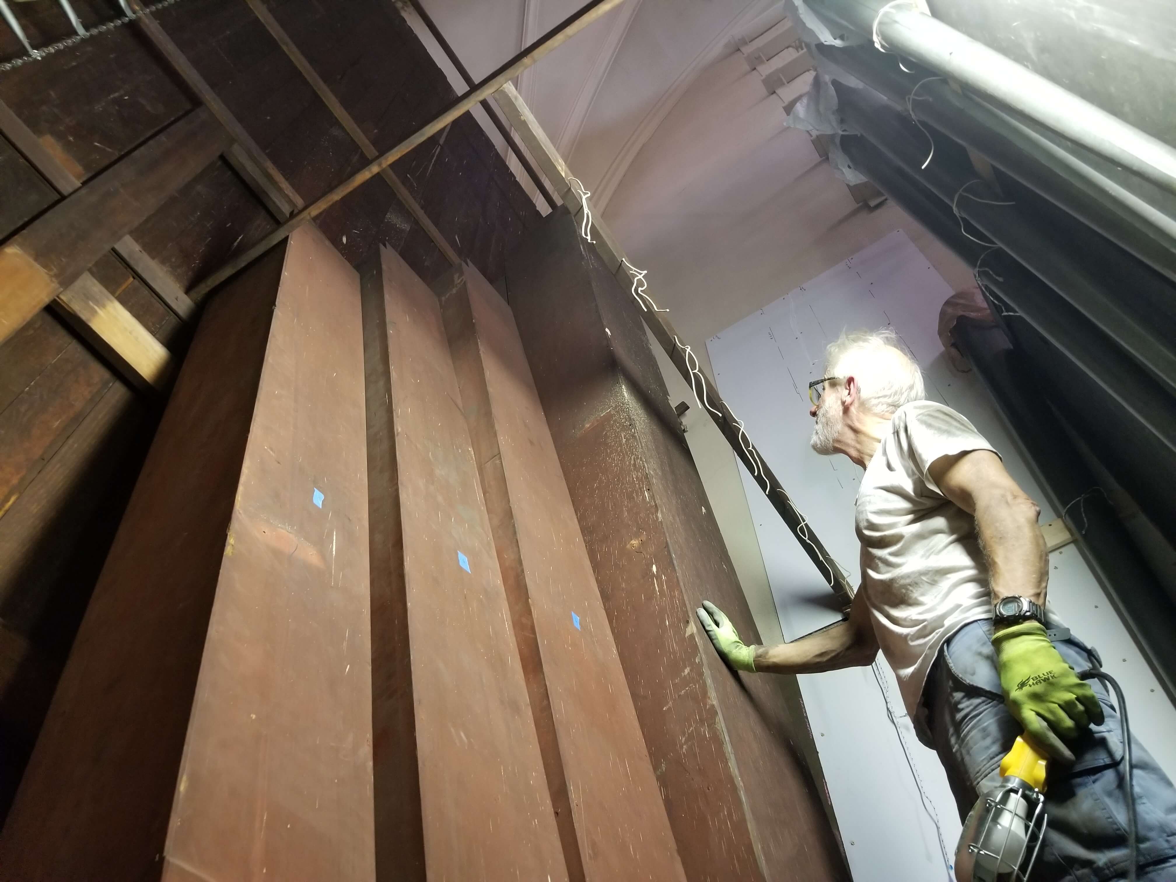 Pictured below: Chris Schaefer, president of Valley Organ Restoration Co and project director, atop 24-foot extension ladder, installing paneling behind organ, to cover deteriorated plaster. Virtually every surface of the organ was covered with chunks of plaster and plaster dust.