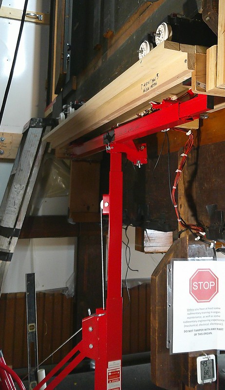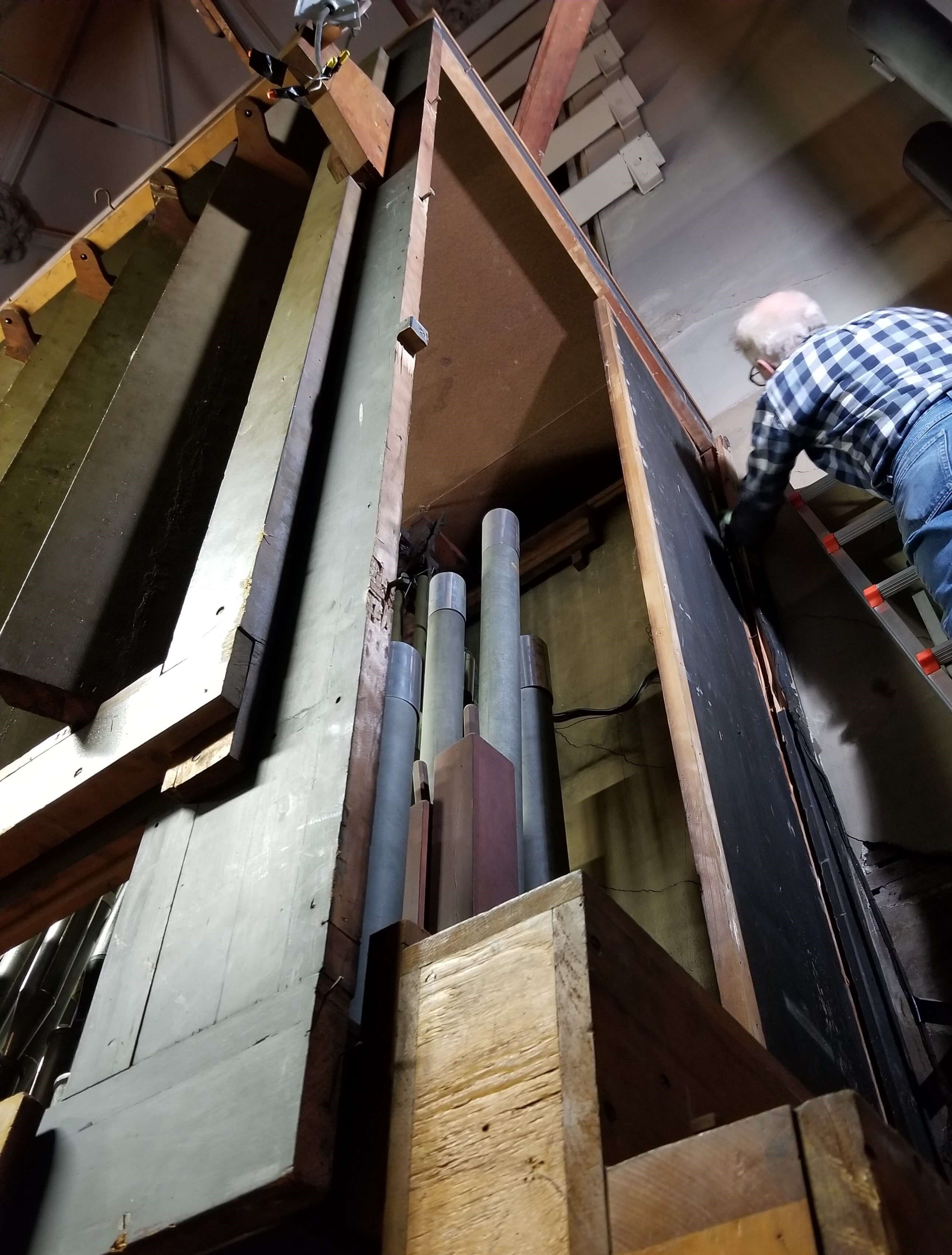 Pictured above: Chris standing on temporary platform while removing a large Pedal pipe