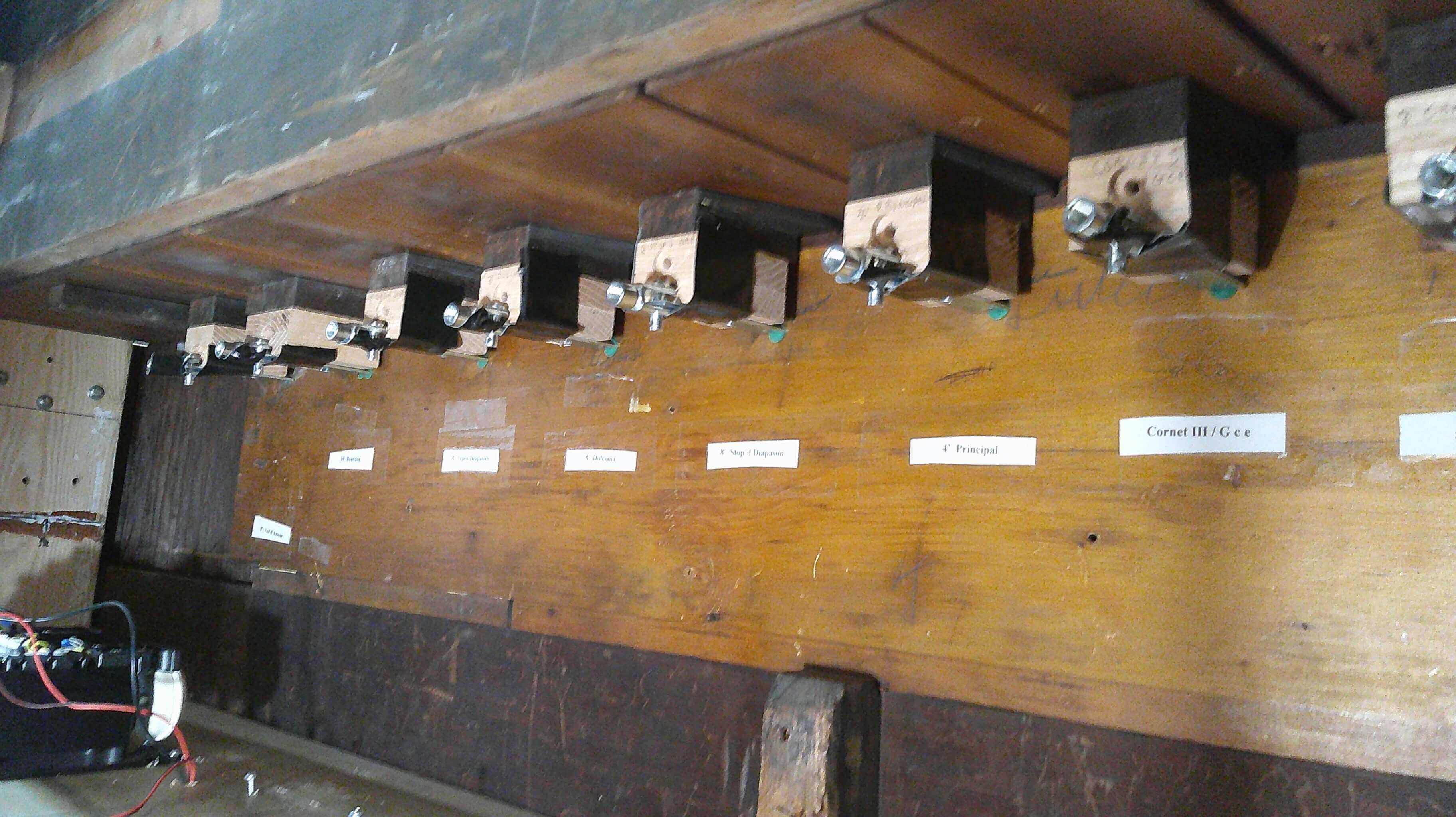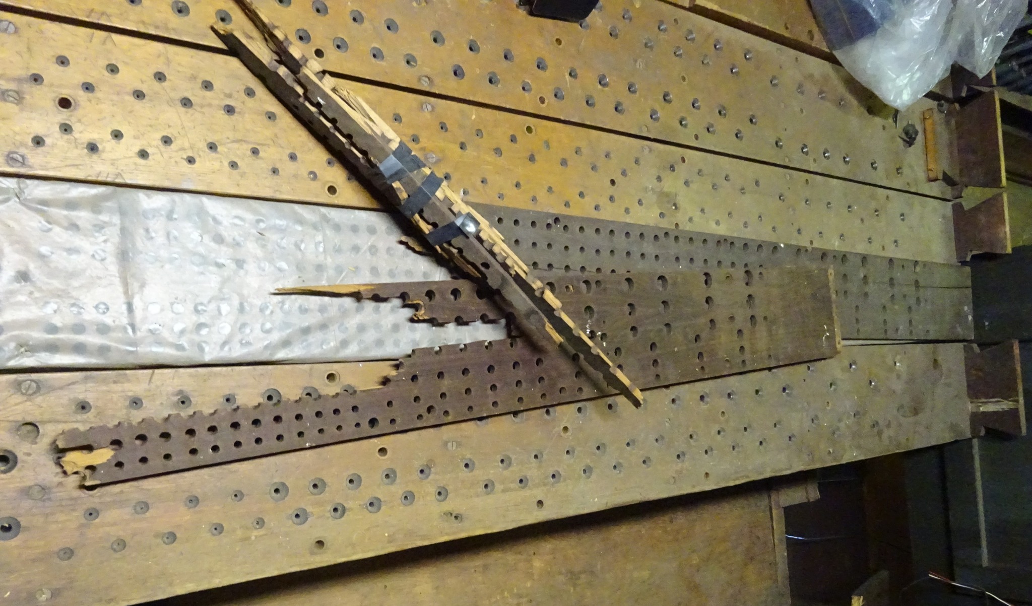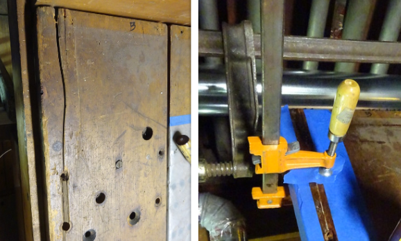 Chris repaired the worst cracks in pipe racks; reassembled pipe rack of Great division’s Mixture and Sesquialtera. The pipe rack holds the organ pipes in an upright position: