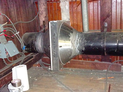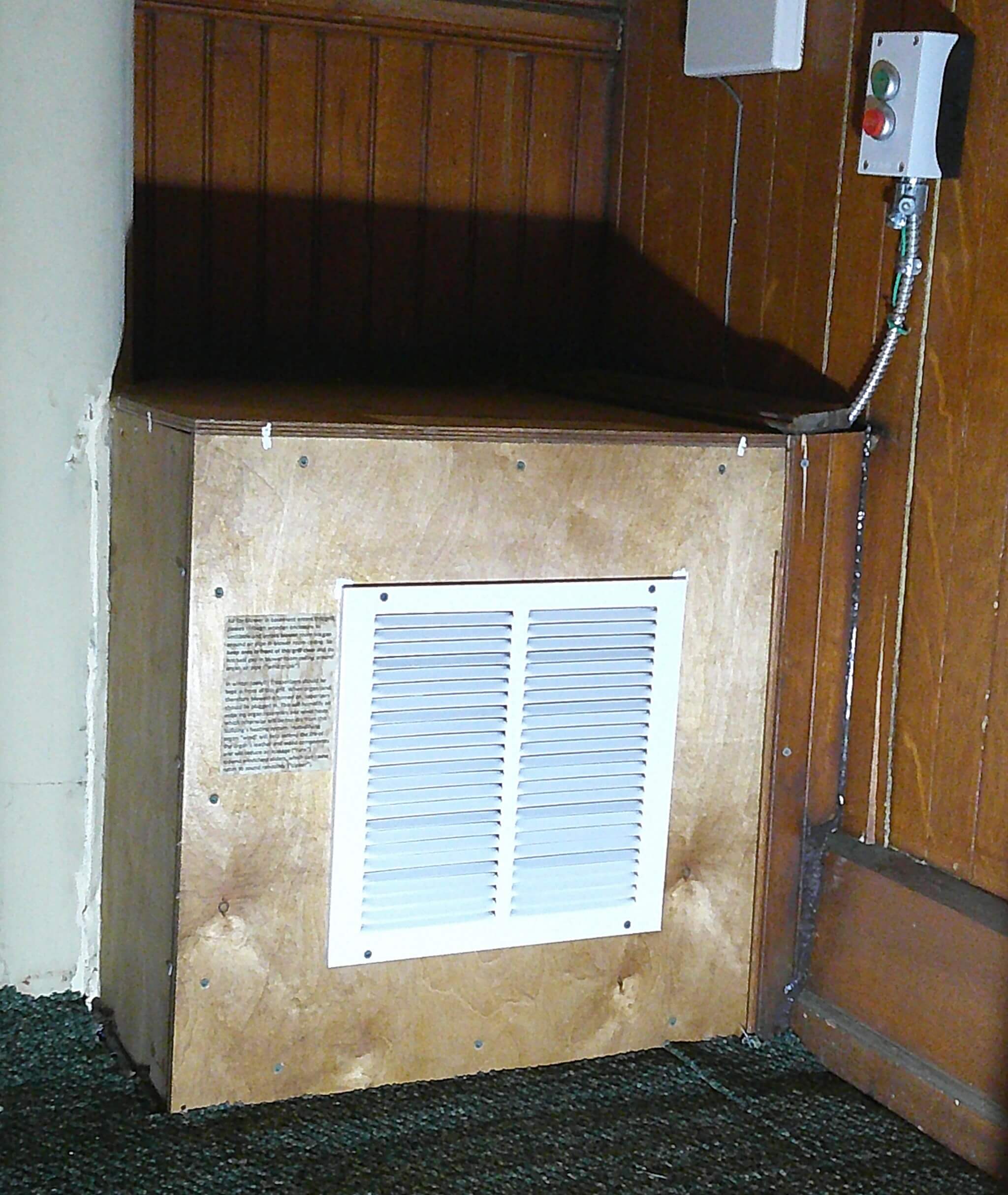 IN 2024 Chris modified the organ blower room, as well as the organ loft’s entry point of the blower’s air duct (“wind trunk”), so that the blower now draws much of its air from the space between the wood enclosure around the wind trunk, via a grill in the organ loft (pictured below), rather than from the basement/church hall. From the basement blower room the pressurized air then returns to the loft inside the wind trunk (a 12-inch-diameter pipe) and enters the pressure regulators (reservoirs) beneath the organ pipes. Using the same air where the organ itself is located to provide “wind” for the organ will help stabilize temperature, humidity and tuning of organ wind chests, reservoirs and pipes: