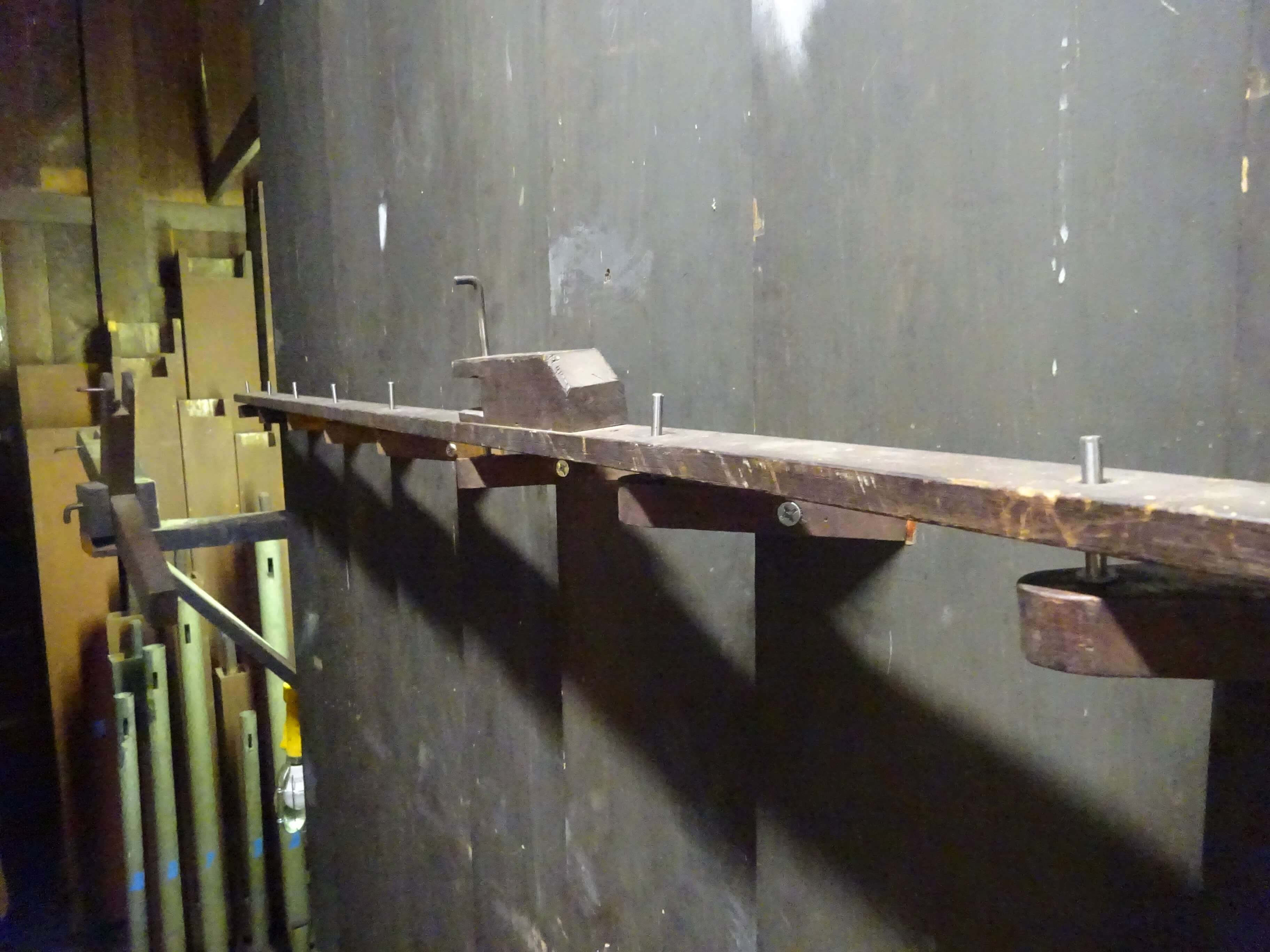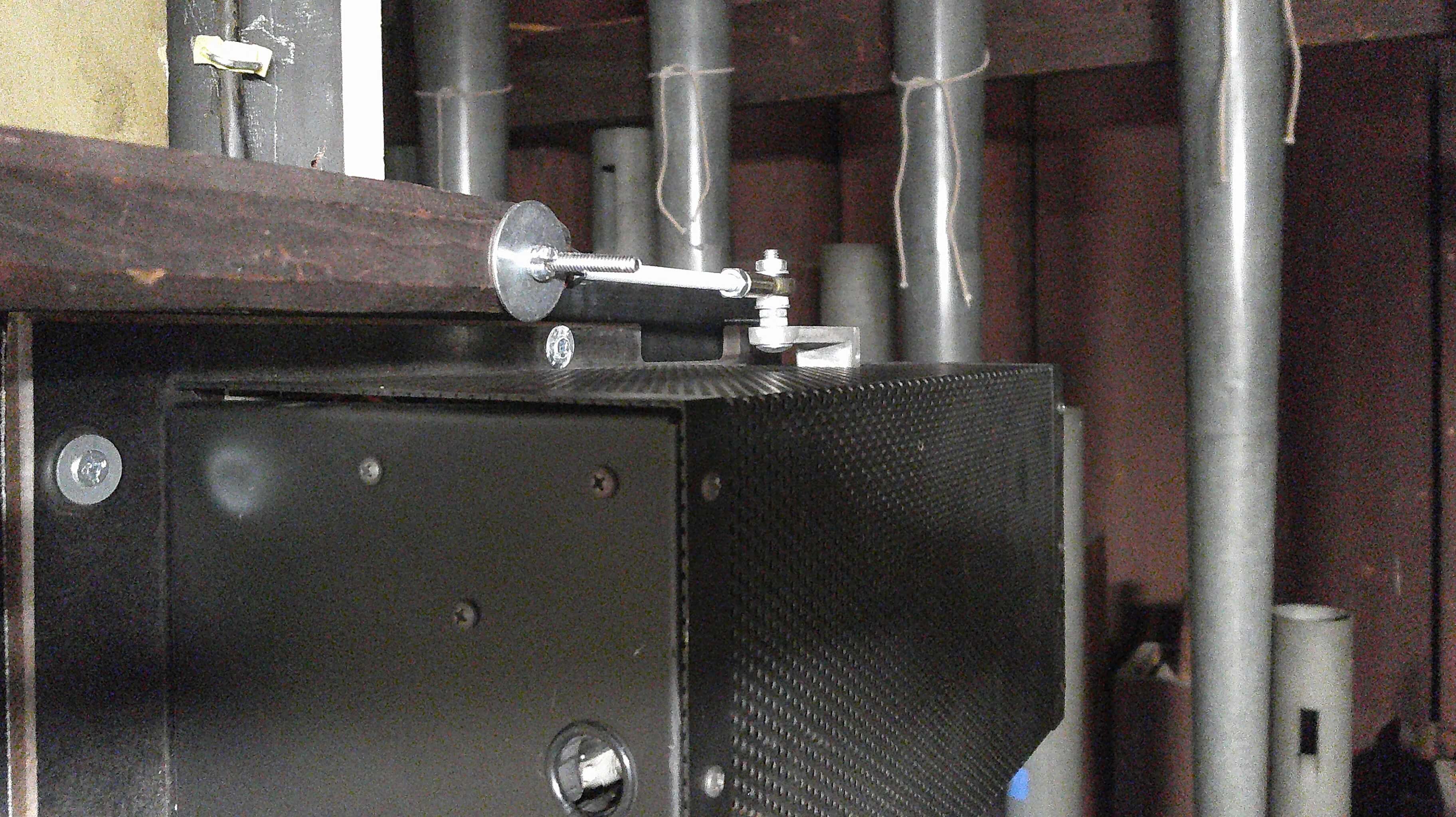 In 2023 Chris modified the shade dogs of Swell and Choir divisions, replacing screws or removable pivot pins with fixed steel dowel pins, and he relocated the Choir division shade dogs several feet lower. With these modifications the trace rod now merely can be lifted off, making it easier to remove shades in front of Swell and Choir chambers when doing maintenance or repairs inside the chambers: