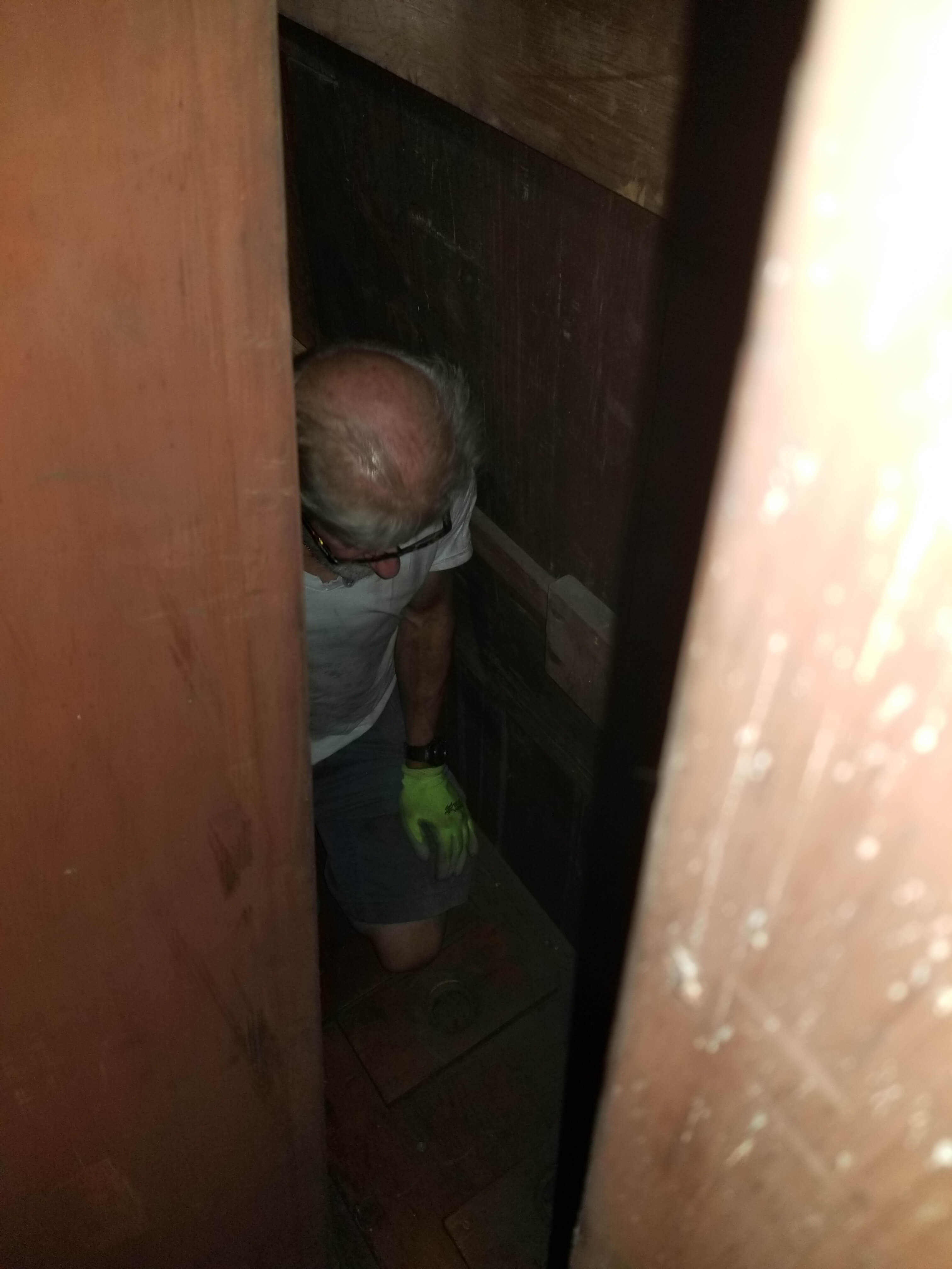 pictured above: former parish organist David (who often had assisted Chris with the organ restoration through 2023) vacuuming top of Choir division wind chest, before the installation of HDF panels over deteriorated plaster wall