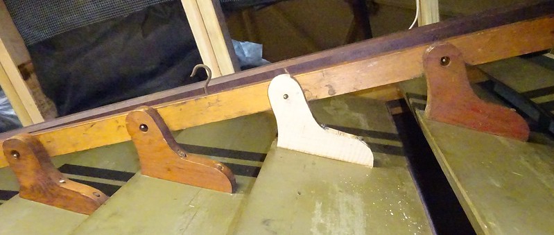For the new German-made solenoid slider motors, Chris constructed a mounting shelf of poplar and maple, held in place at each end with large pieces of Douglas fir and lag bolts: similar to what he has built for the Swell division and Great division.