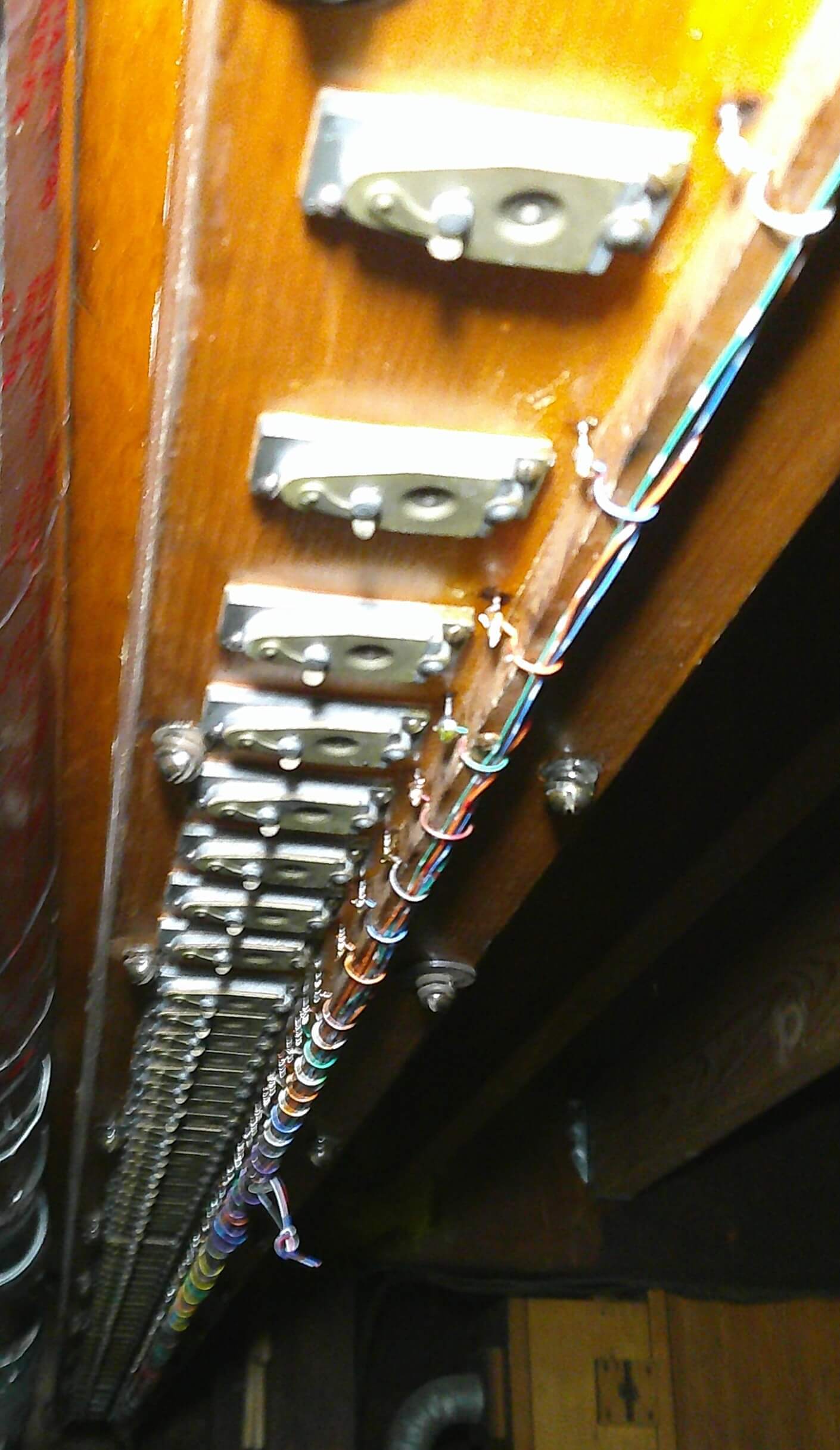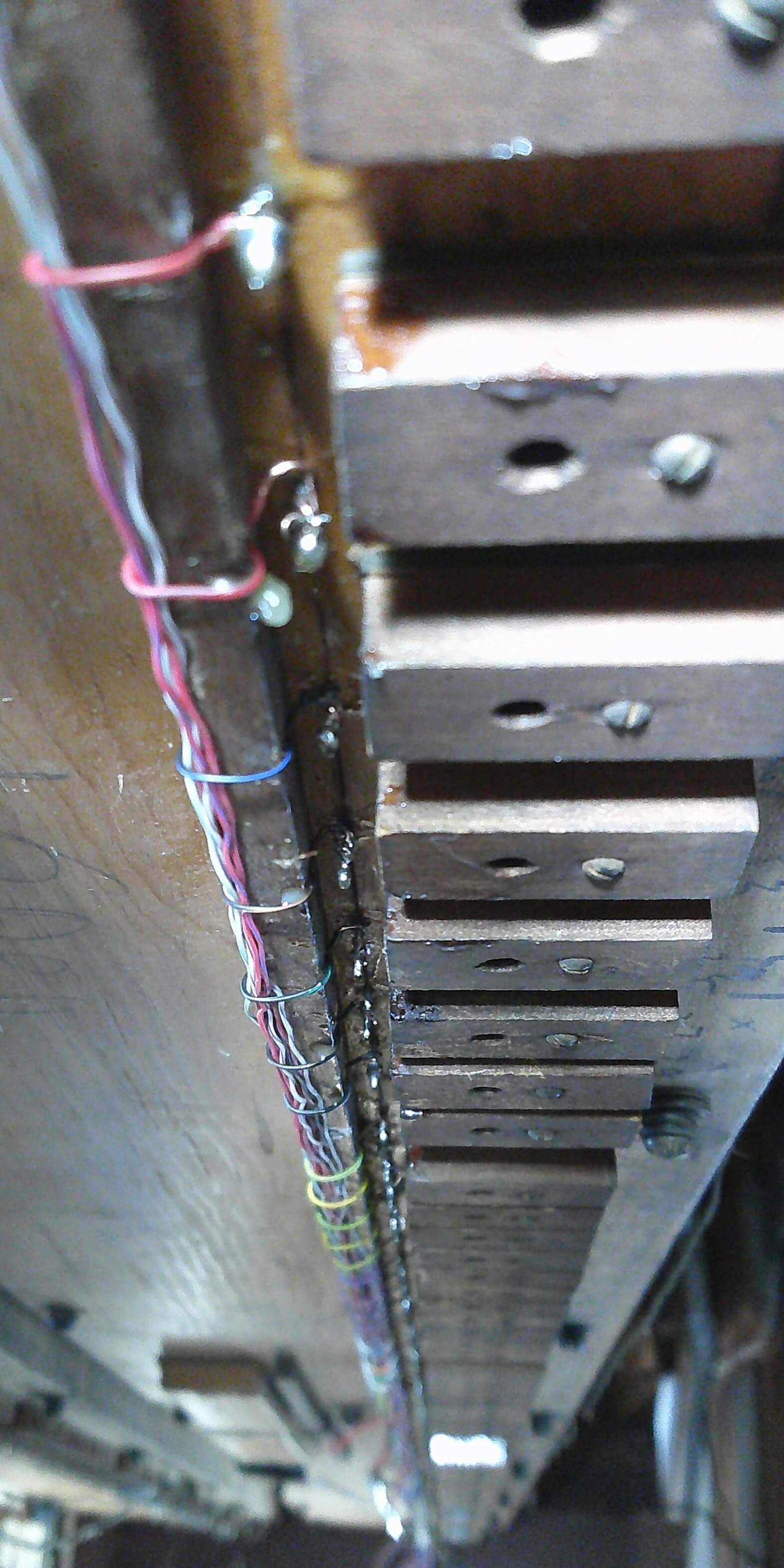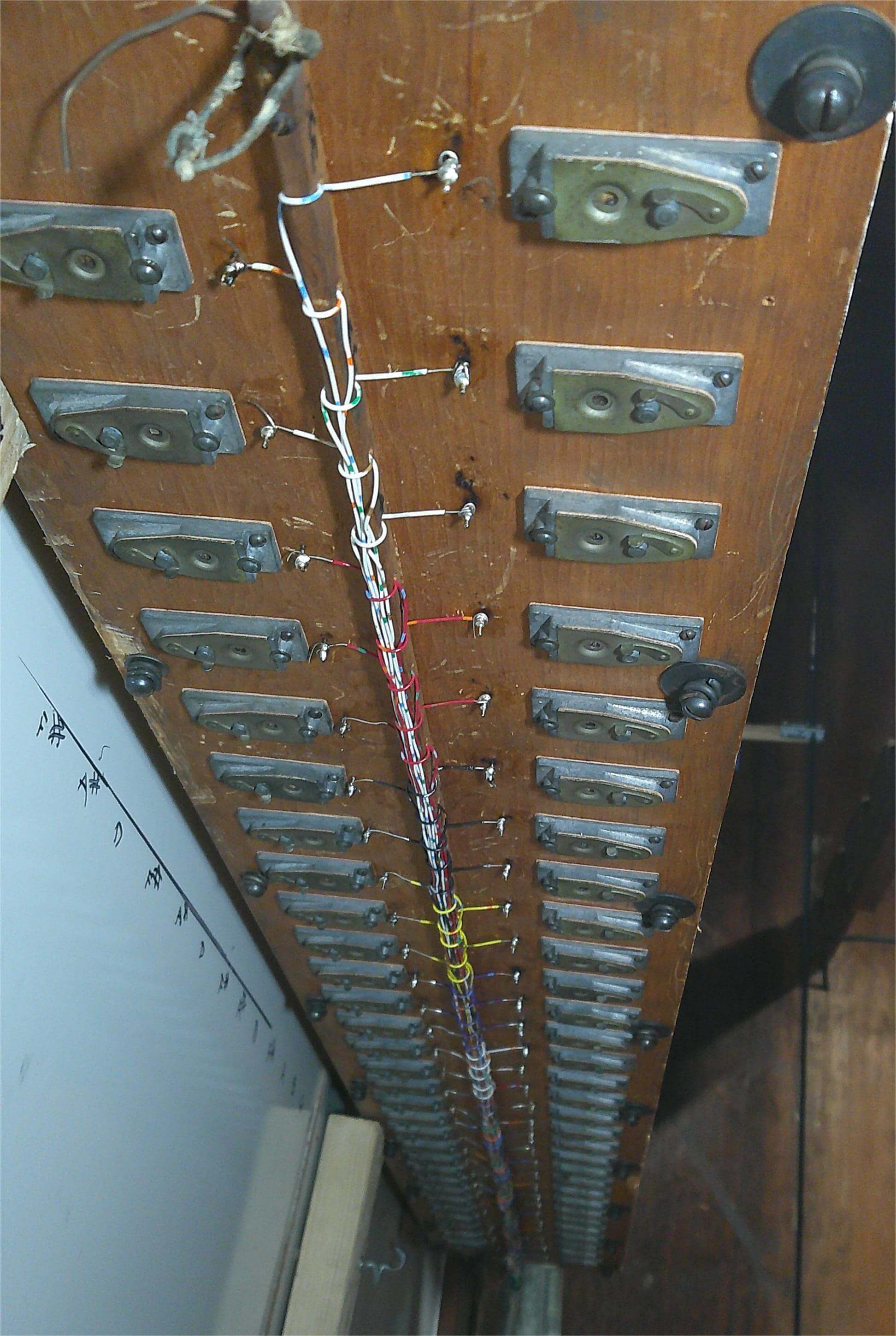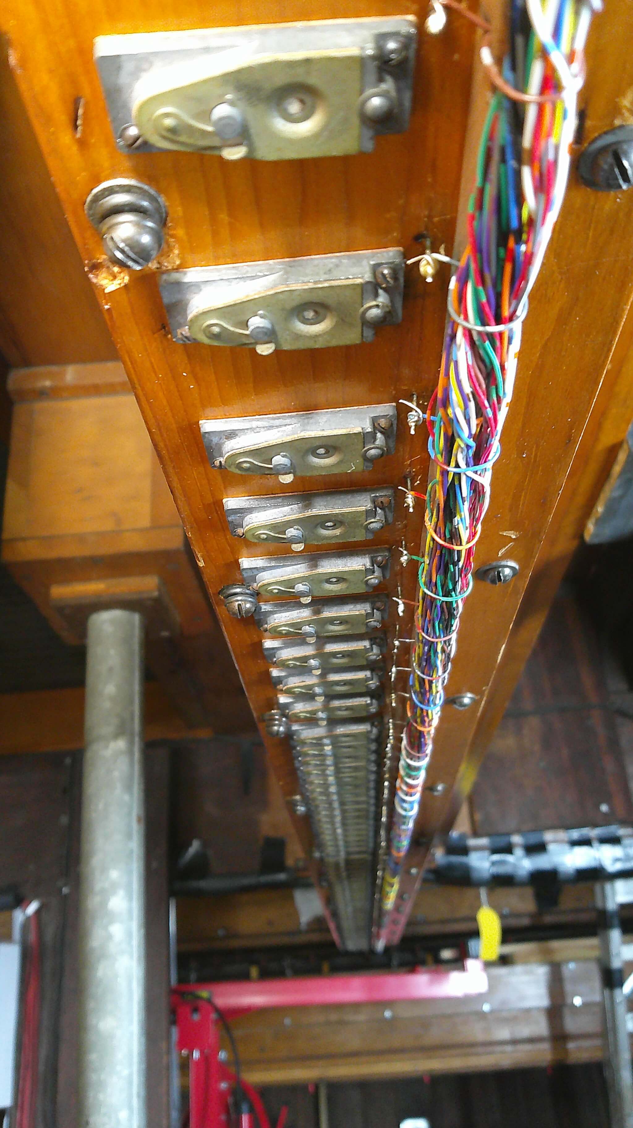 So far, Chris has completed this on the Great and Swell divisions’ main wind chests, the Swell division’s Vox humana wind chest, the Tuba Minor wind chest and one of the three wind chests of the Great Grand Open Diapason, using color-coded telecommunications (telco, Cat3) cable. Each color combination indicates a specific pitch, which will make it easier to connect each wind chest to a new control system. Some of the wind chests pictured below will need additional work, e.g. new electromagnetic valves aka “magnets”. However, this can be done without removing the new cable: