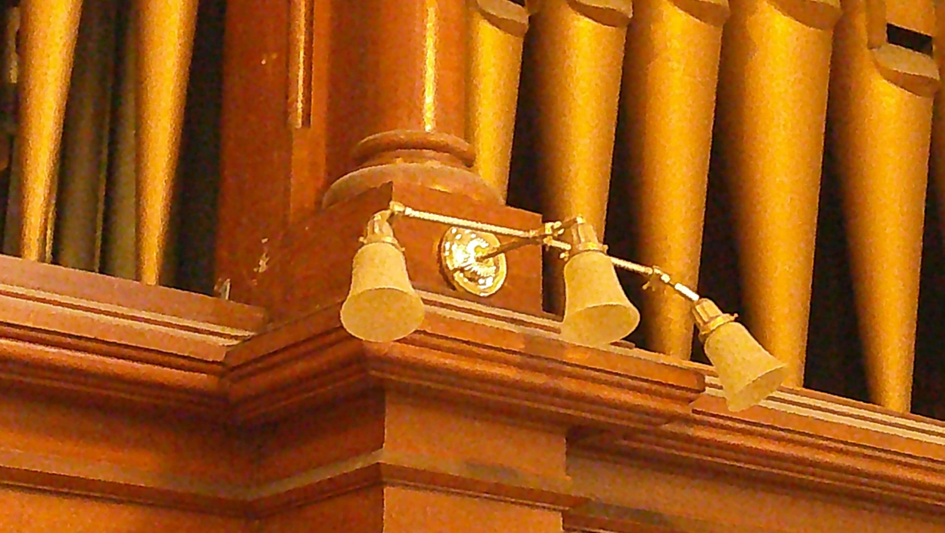 …and new retro-style fixtures were custom made by Christopher Schaefer (president of Valley Organ Restoration Co). These brass fixtures have ‘heads’ that can be adjusted up, down, left, right. Each fixture is supplied with three, 7 Watt LED mini-flood light bulbs, using a total of only 21 Watts per fixture: