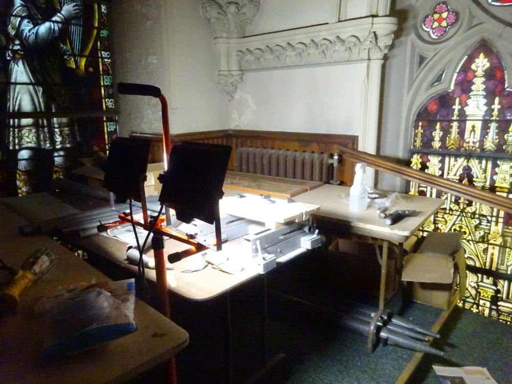 Chris created a permanent loft workshop for his company, Valley Organ Restoration Co, to perform minor, ongoing organ repairs, e.g. releathering wooden pipe stoppers and smaller components: