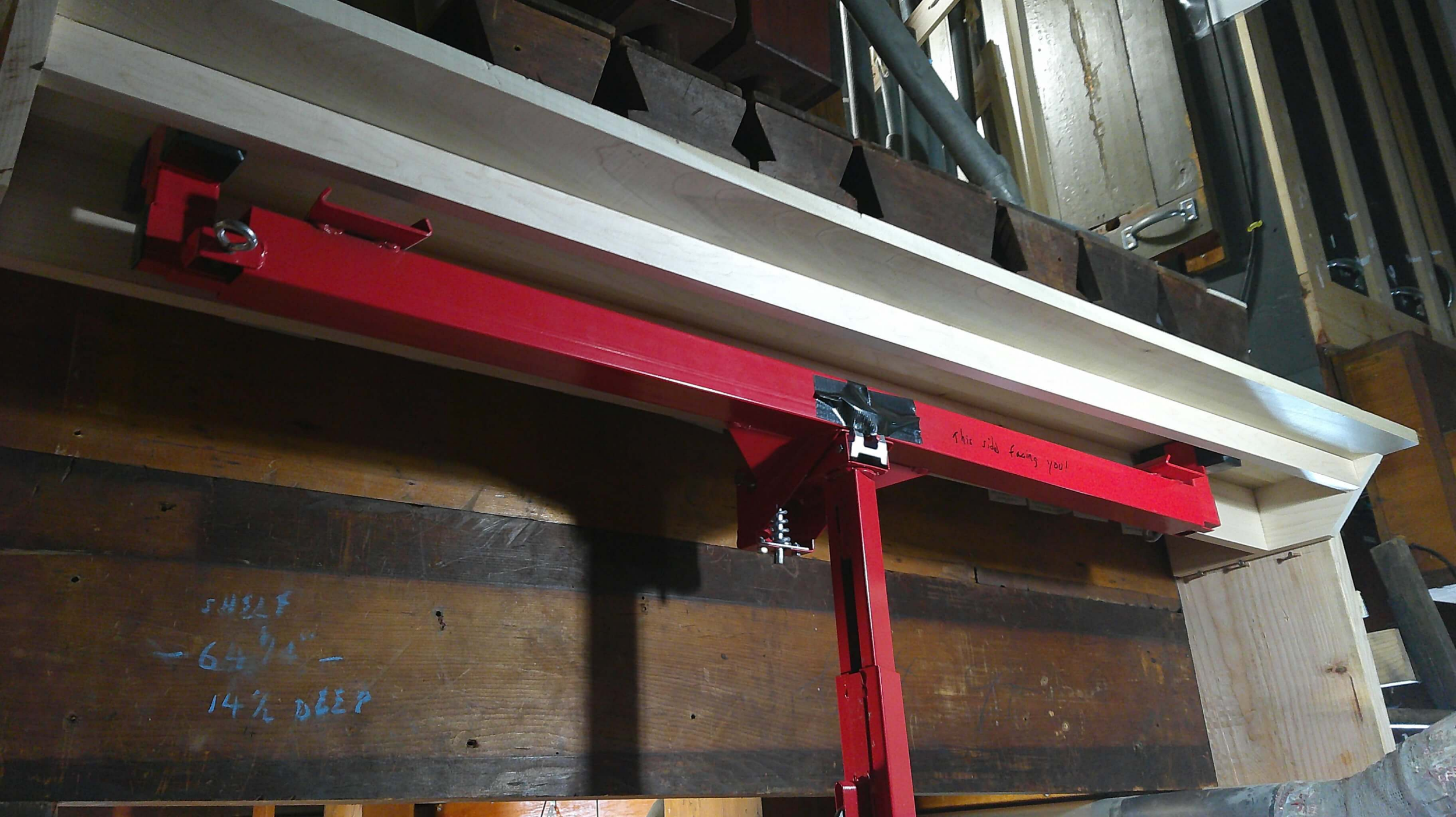 In August 2025 Chris added the mounting structure for the 13 solenoid slider motors to be installed for the Great division. A poplar board with maple supports below it was raised into position, using a drywall lift: