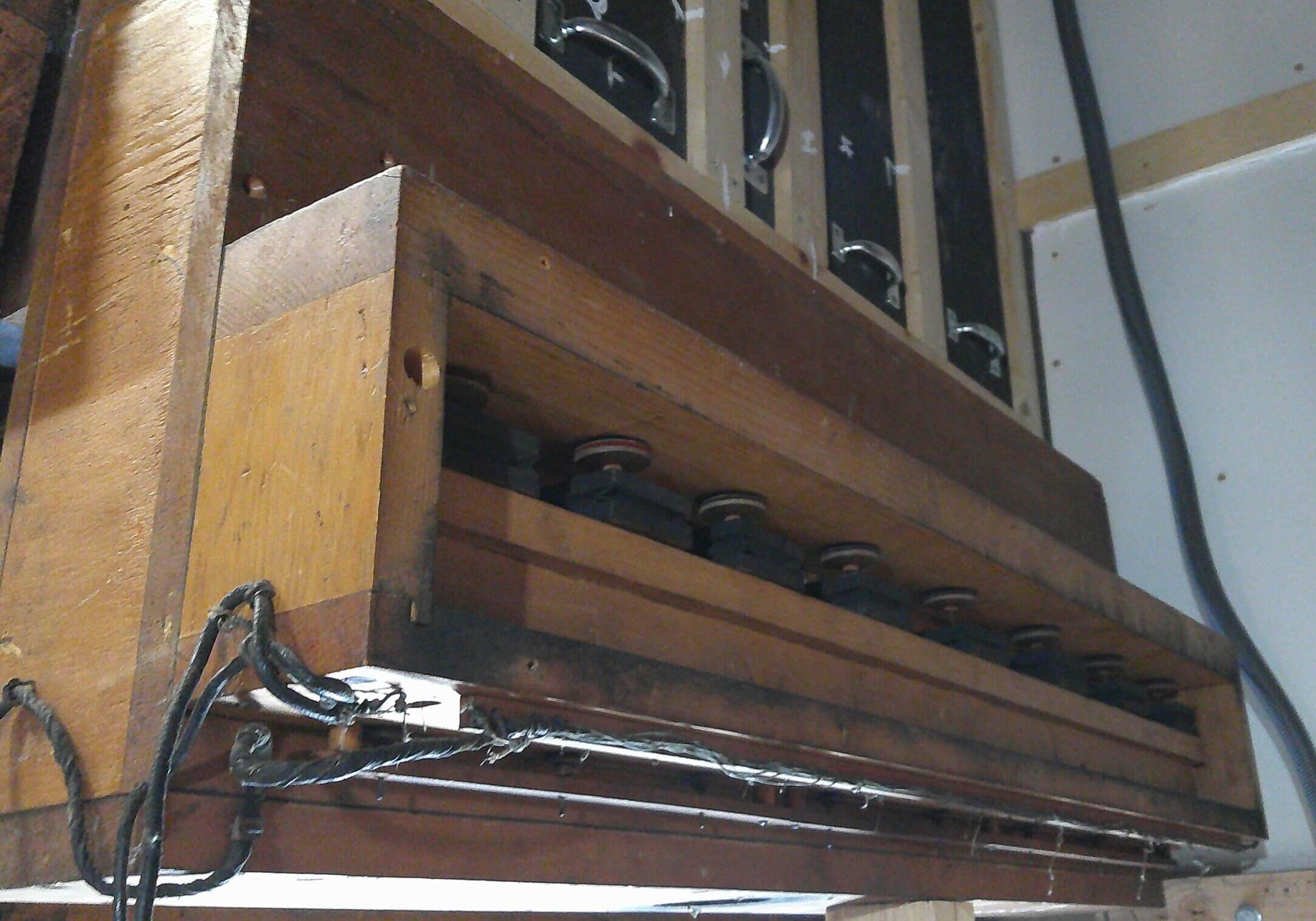 In 2024 Chris installed shade motors for Swell and Choir shades, replacing the 1923 whiffletree motors which no longer worked. The two motors were procured by Valley Organ Restoration Co, at no cost to your parish, from a recently dismantled but well-maintained organ in Pennsylvania: