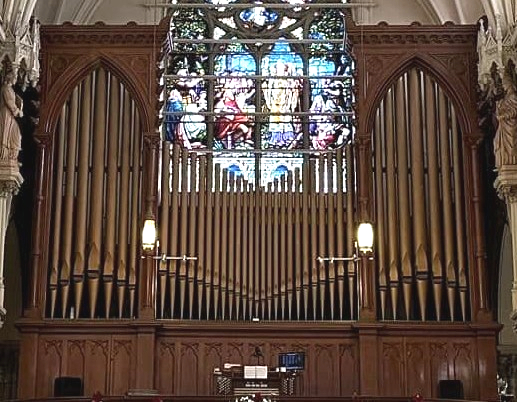 In 2021 a 1927 E.M. Skinner, 3-manual & pedal, pipe organ console was procured at no cost to your parish. This console was gutted & refitted c. 2007 with new draw knobs/Stop Action Magnets (SAMs) & keyboard electrical contacts. The console currently is used to control recorded (“sampled”) imitation pipe organ sounds, played through speakers, which is what you currently hear on Sunday morning. However, the keyboards’ and draw knobs’ modular electrical connectors easily can be attached to a new solid-state Pipe Organ control system.