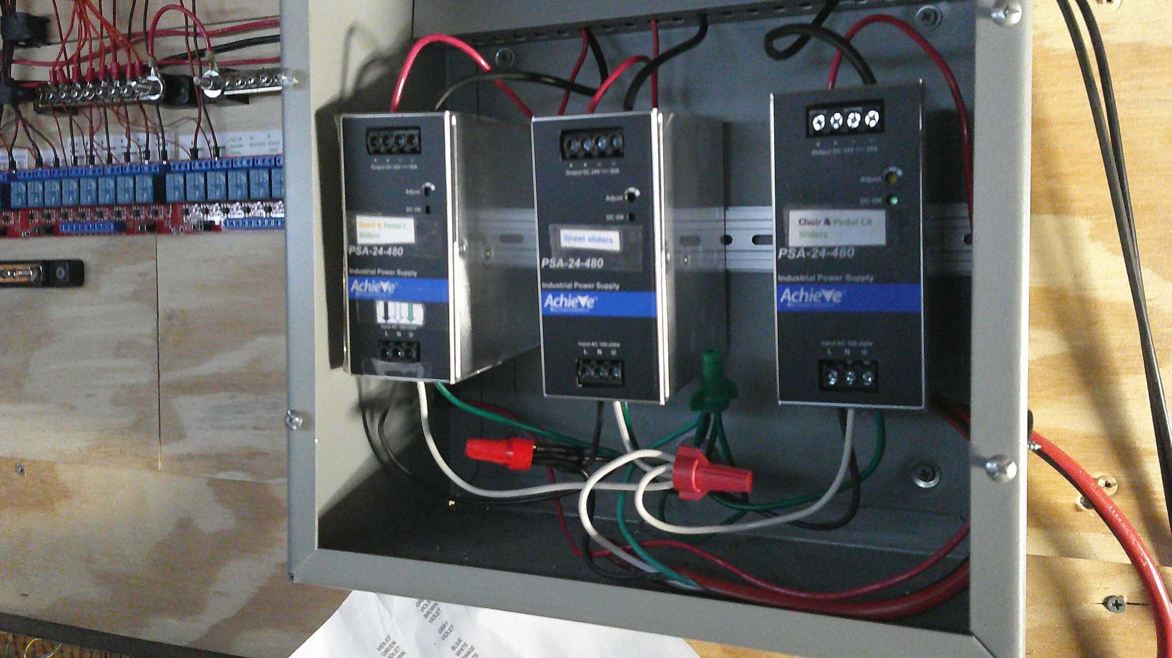 On this same mount, Chris installed the 24VDC power supplies for the slider solenoid motors. Ultimately the 38 slider motors, in groups of 12-13, will be powered by these three power supply units: