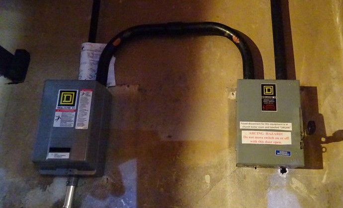 In Nov. 2020 the organ blower room in the church’s basement hall was cleaned for the first time in nearly a century. Several months later, Chris Schaefer (president of Valley Organ Restoration Co) replaced the hazardous 1920s motor starter and shut-off switch in the blower room with a new Square D motor starter and safety shut-off switch for the 1923 OrgoBlow blower’s 3-phase Westinghouse motor. (Motor was rebuilt in c. 1978 and is in excellent condition; the blower provides the pressurized air for the organ pipes.)