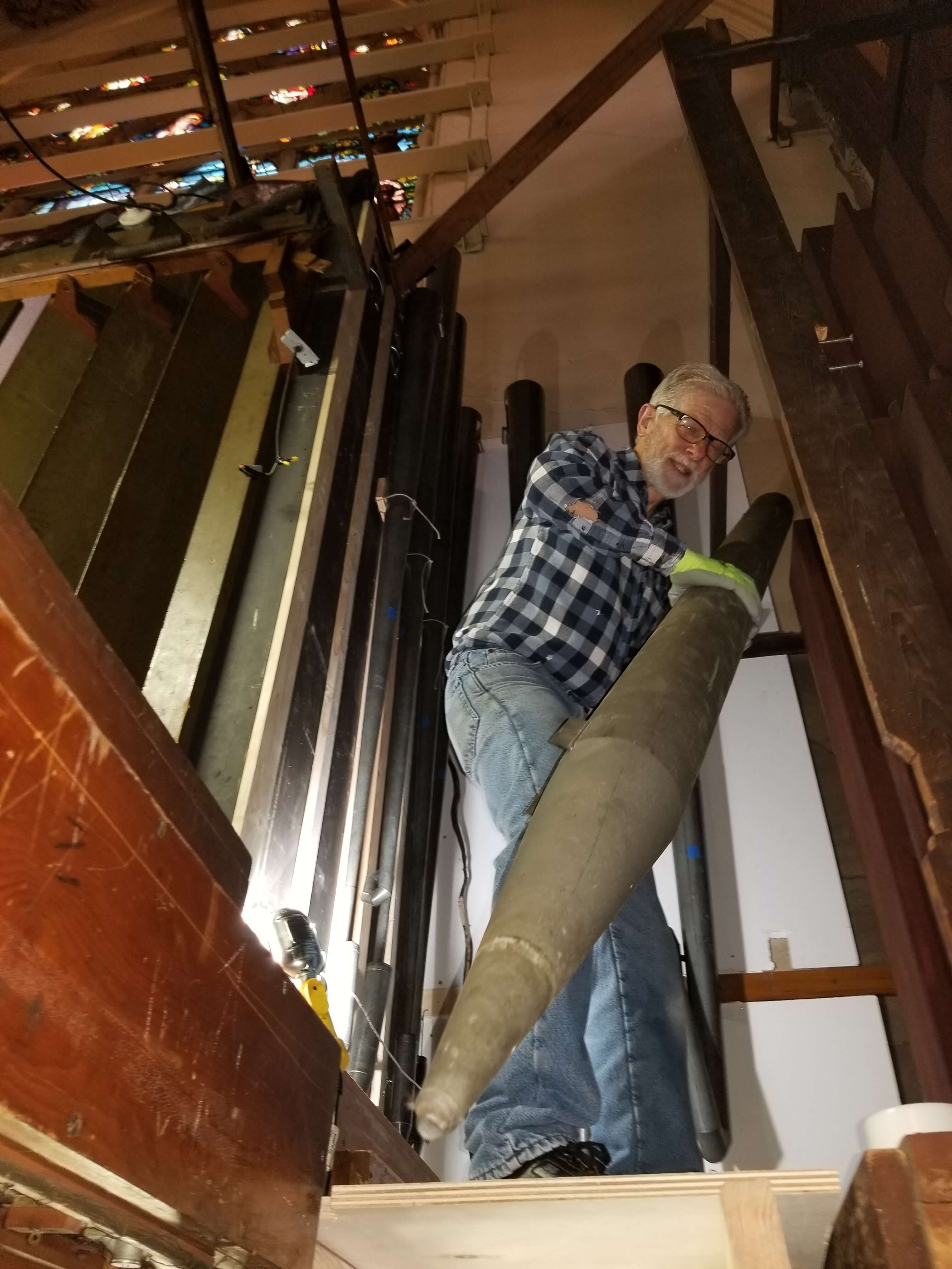 Pictured above: Chris standing on temporary platform while removing a large Pedal pipe