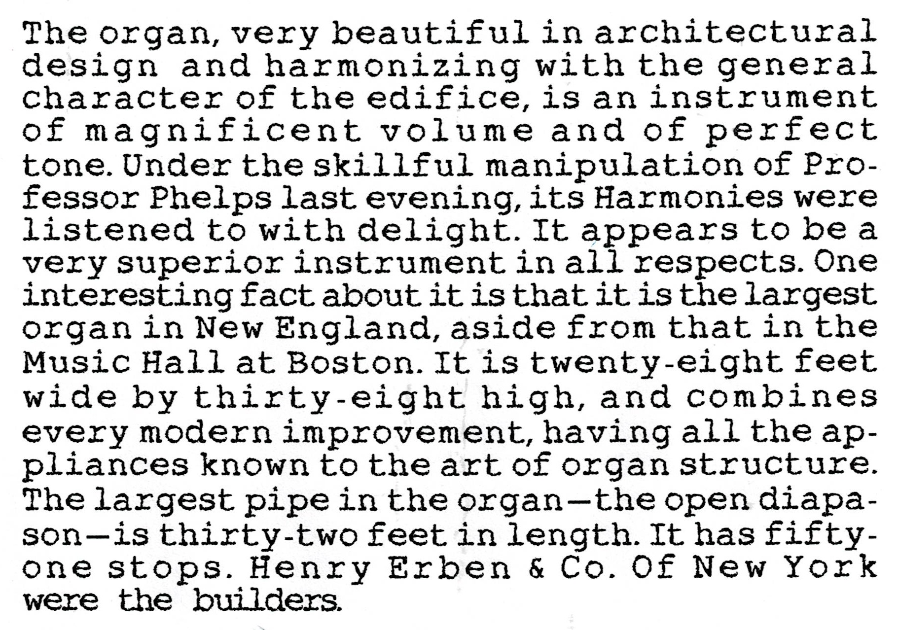 Specifications of 3 manual c. 1870 Erben, Plymouth Congregational Church