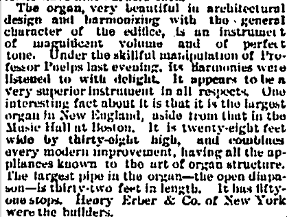 * Hartford Daily Courant 40 No. 283, Nov. 27, 1876, p. 2; American Arts Journal 26, No. 10, Dec. 9, 1876, pp. 128-129; Music Trade Review, Feb. 18, 1877; cited on page 178 of The Work-List of Henry Erben Organ Builder in Nineteenth-Century New York by Pinel, Stephen (Villanova, PA: Organ Historical Society, 2021)