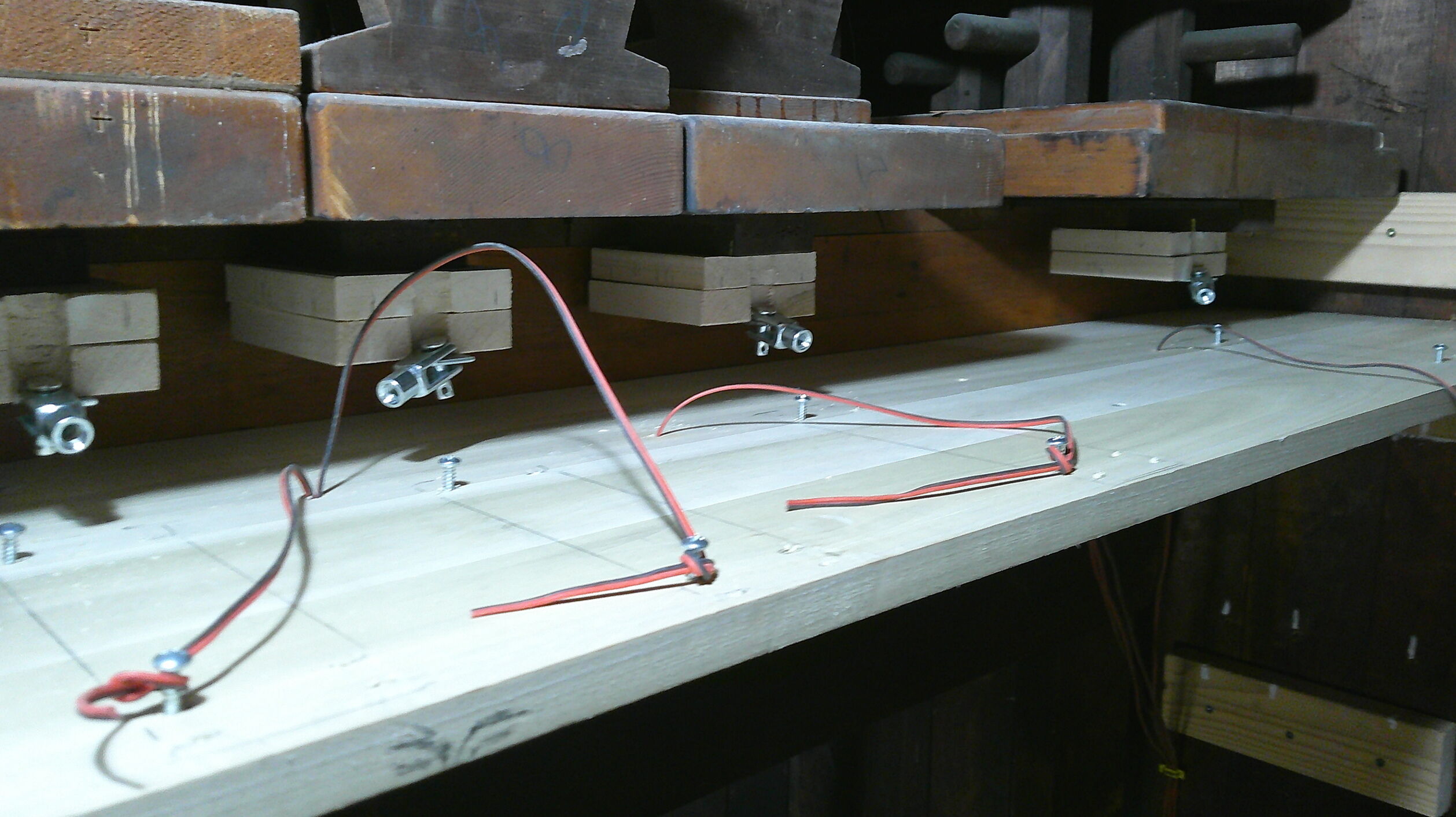 For the new German-made solenoid slider motors, Chris constructed a mounting shelf of poplar and maple, held in place at each end with large pieces of Douglas fir and lag bolts: similar to what he has built for the Swell division and Great division.